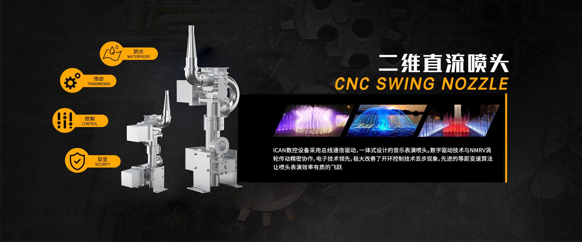 实现一台设备,演绎多种样式水型,同时搭配直流、水膜、扁嘴喷头。每转动120或180度,会呈现不同的样式,同时不喷射的喷头水能够彻底关闭,最大限度的利用水泵的新能,喷头之间的切换能自然衔接。